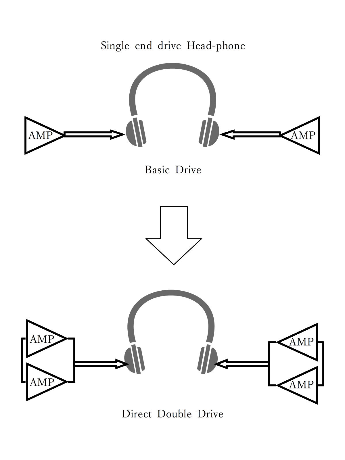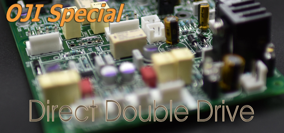 OJI Specialでは バランスヘッドフォン再生の豊富な経験を生かし、シングルエンド再生でバランス再生と同様なハイクオリティーなサウンドにならないか と言う課題に挑戦してまいりました。シングルエンド再生の欠点である 「対称になっていない部分」を バランスアンプのそれとは異なる技術でバランス再生のように具現化したのが Direct Double Driveです。