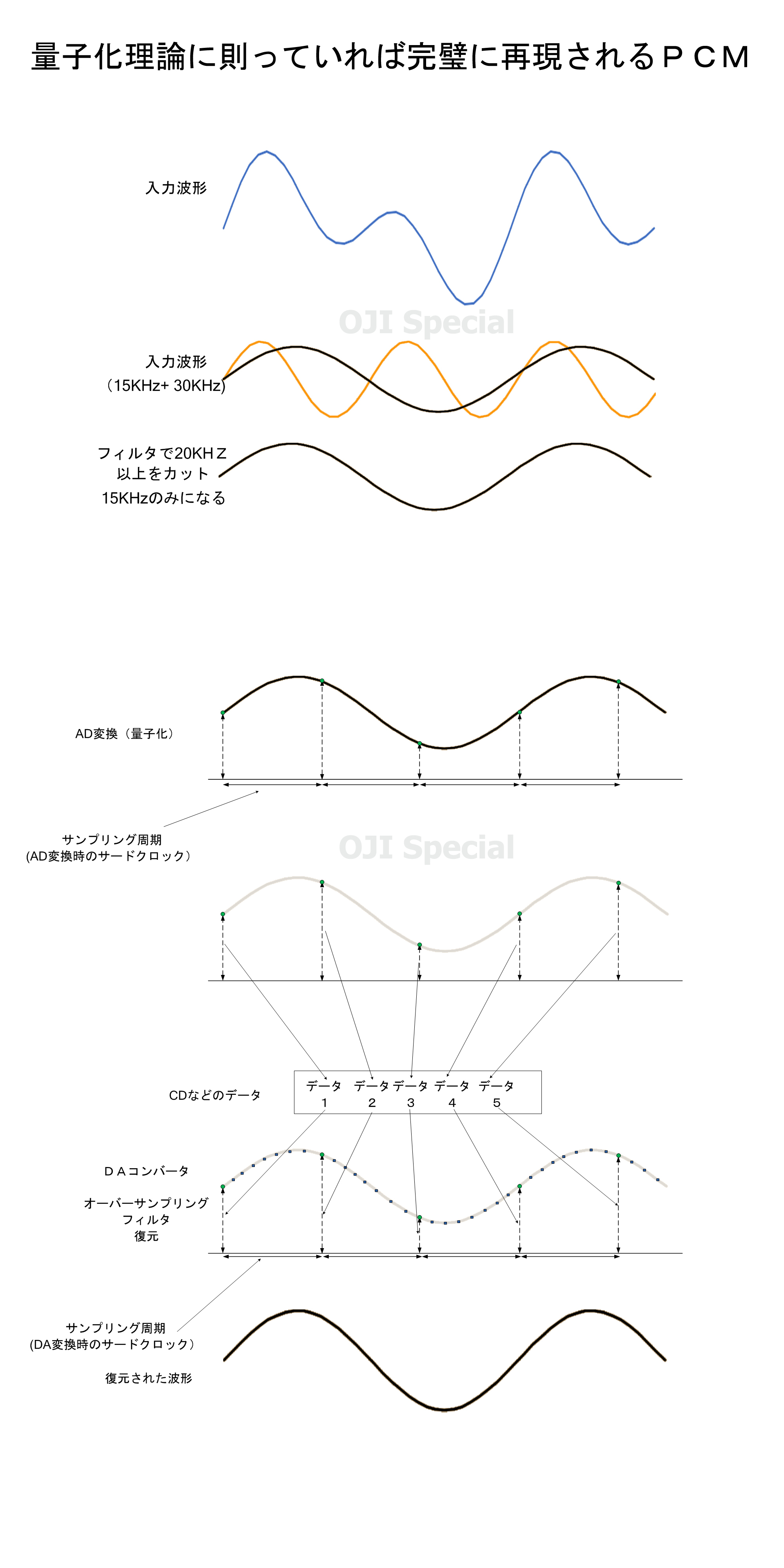 PCM(パルス符号変調)は アナログ信号をパルス列に変換する というようなことから ギザギザするイメージがありますが、実際には PCMの基本となるサンプリング定理(標本化定理)をきちんと守り使用して復元すれば ギザギザは生じず、元の原音波形が再現される方式になります。