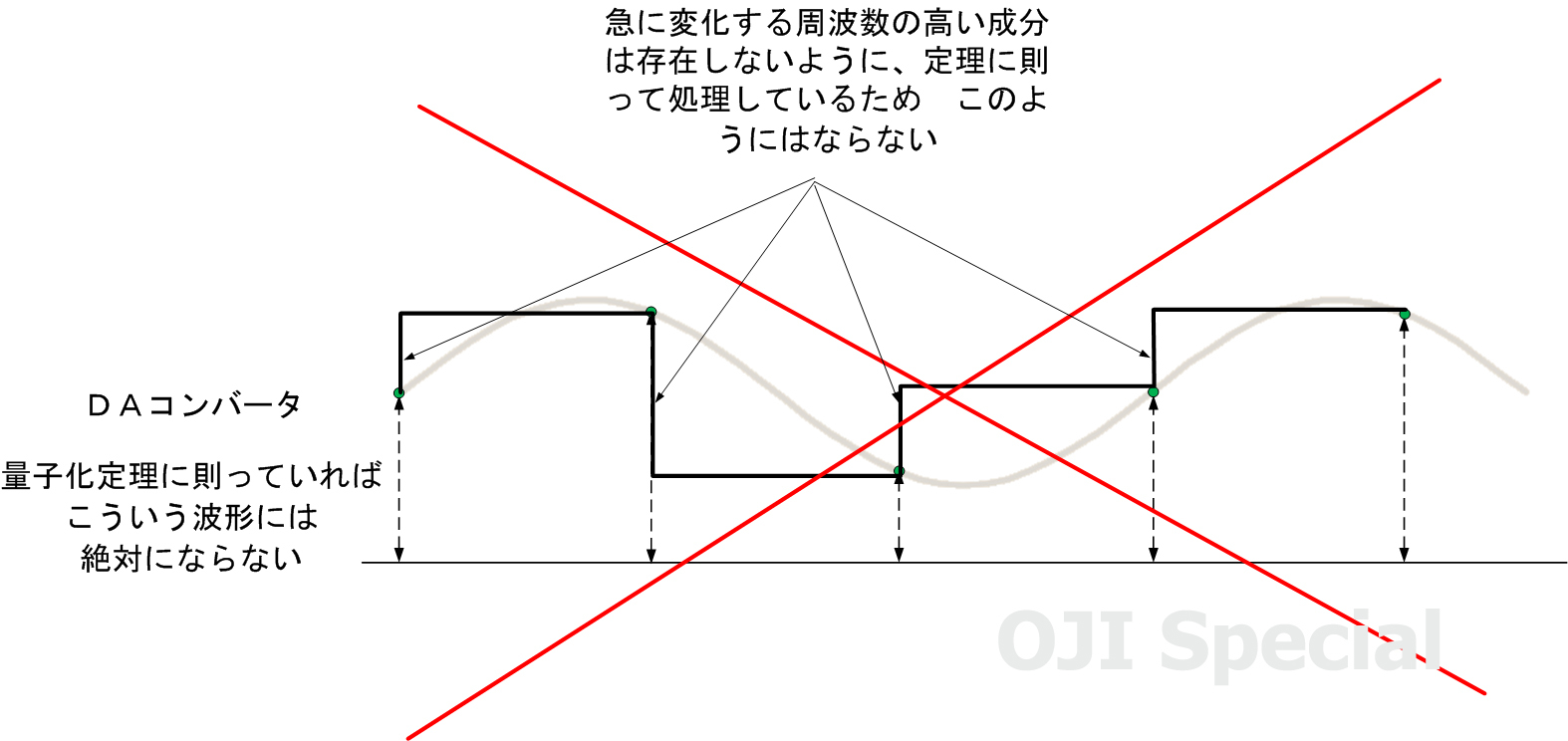 ※サンプリング定理を守らないシステムやDAC、たとえば フィルタを使用しないDAC、クロックにジッタがあるDACなどは原音には無い音、つまり歪が生成され付加されてしまいます。音質は変わりますが、歪を付加された音を聞いていることになります