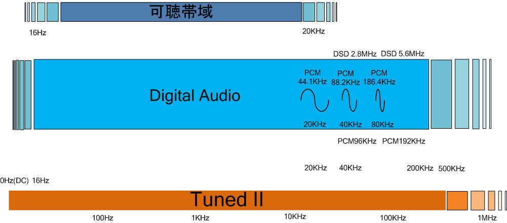 もはや常識化しつつある ハイレゾ再生の PCM「192KHz」や「384KHz」、DSD「5.6MHz」や「11.2MHz」といった規格の広帯域かつ高分解能のデジタル再生を生かすためにはレベル方向だけで無く、可聴帯域外までも、確実に再生することで可聴帯域の音質向上をするという 最先端の再生方式を生かす為の帯域を考慮し、従来からの 0Hz(DC)からの広帯域再生はもちろん 高域は数百キロヘルツからメガヘルツ帯のチューニングを行いました。