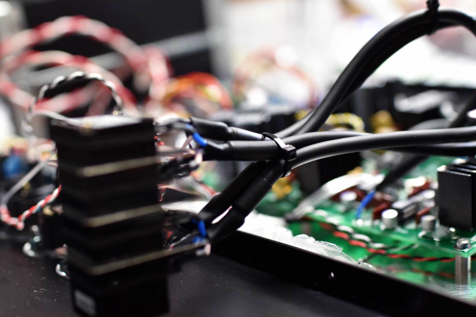 バランスアンプは 通常のチャンネルセパレーションだけで無く、同一チャネルの ホットとコールドのセパレーションまでもが非常に大切です。独立した4つのトランスと電源を限られたスペースの中でEMCとEMIの双方の特性向上させるために、アンプ基板を取り囲む構成で配置。AC電圧電源配線や低レベル信号配線は 2mm厚さの非磁性体シャーシでサンドイッチする構造を採用。4つの独立電源というだけでなくそれらを最高の状態で生かすよう設計されています。