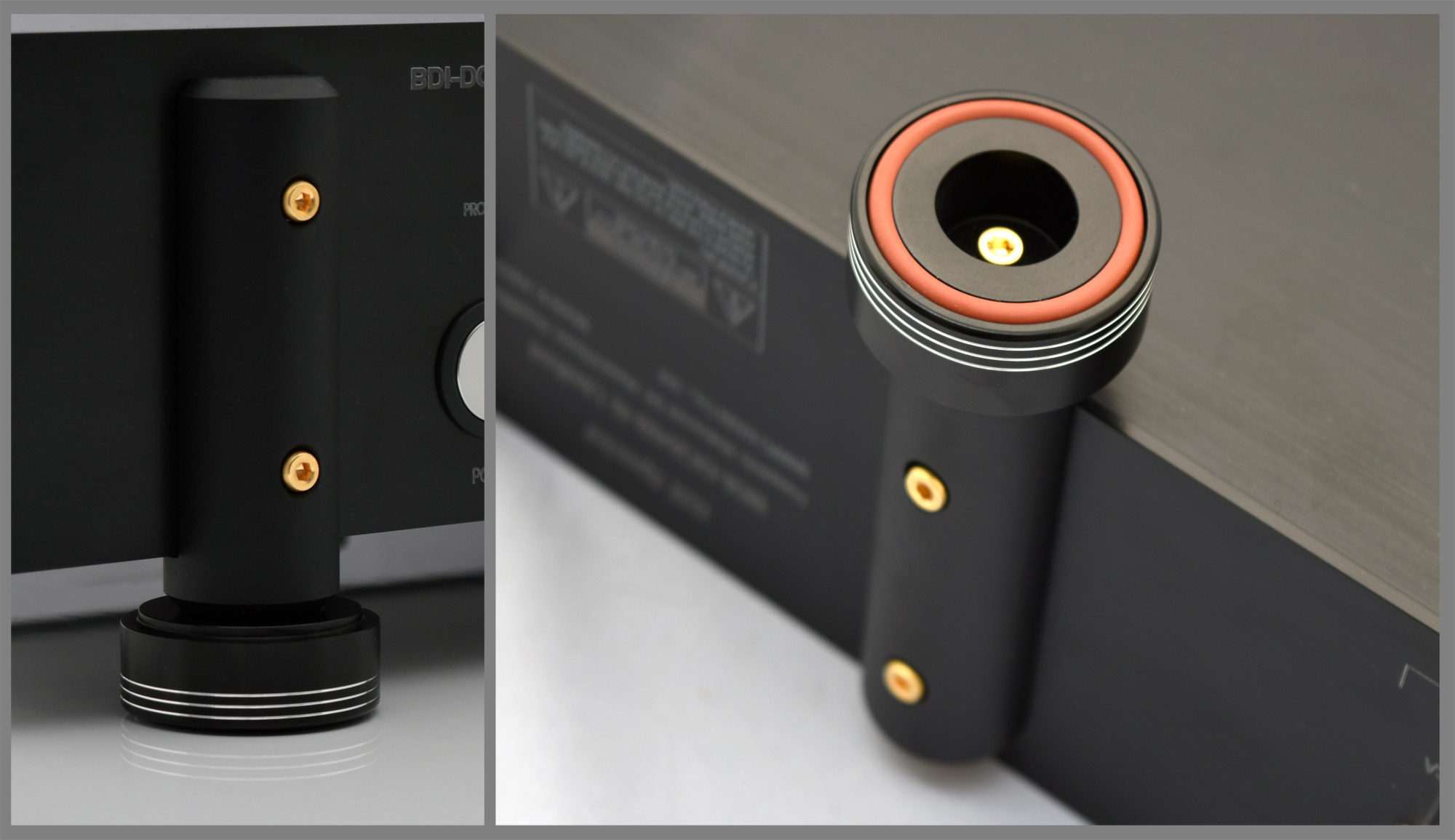 HiRISインシュレータシステムの要となる支柱は筐体の最も剛性が高い部分を利用し、ボルトの特性として接合性を飛躍的に上げる金メッキSUSボルトで精密かつ強固に接続しています。